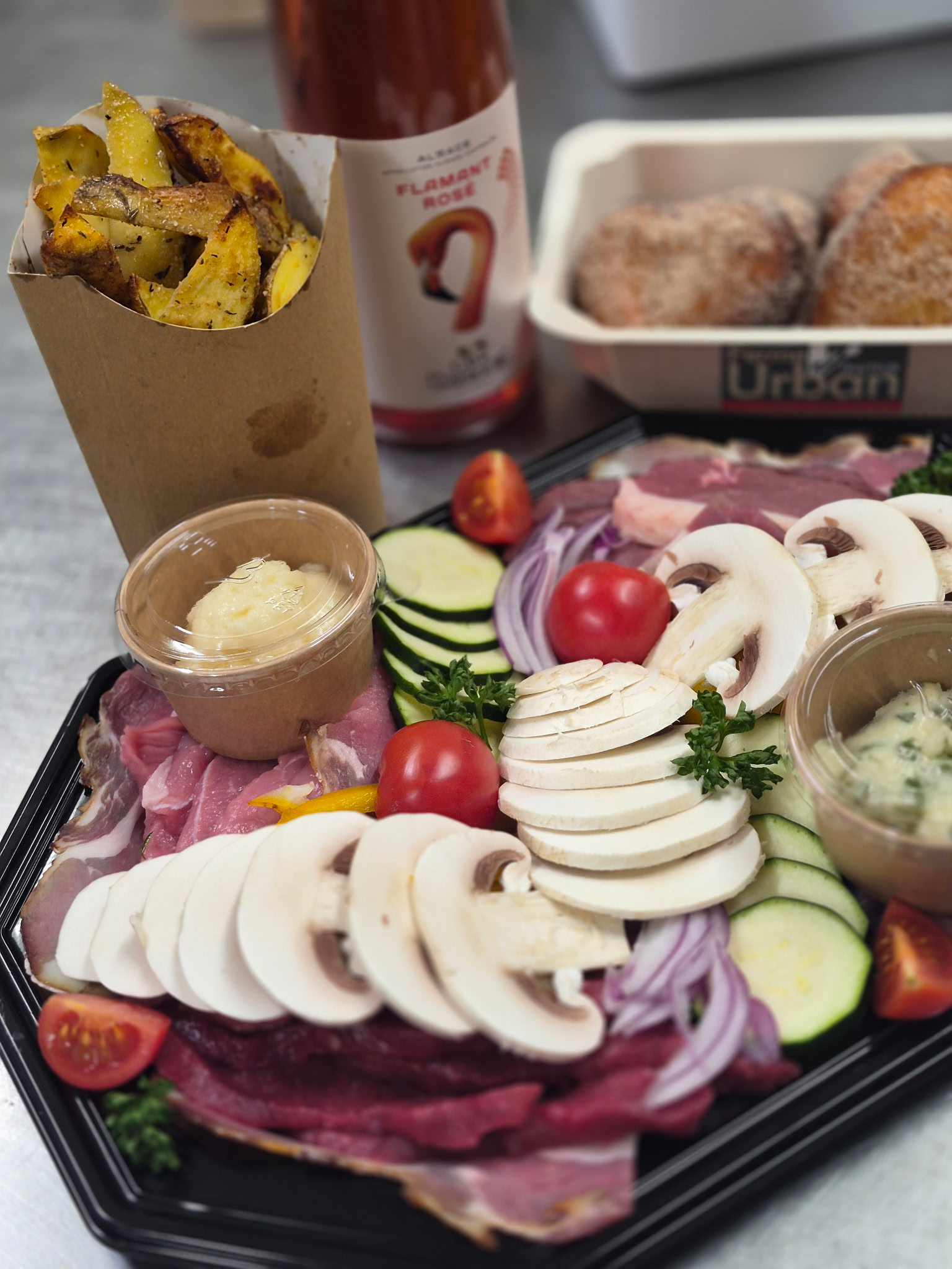 Assortiment de bœuf, canard, volaille, veau, lard pour pierrade. Accompagné de légumes émincés et tomates cerises + 2 sauces faits maison (mayonnaise nature et aïoli).